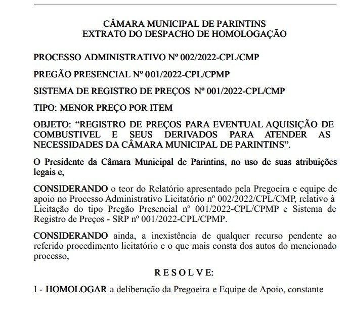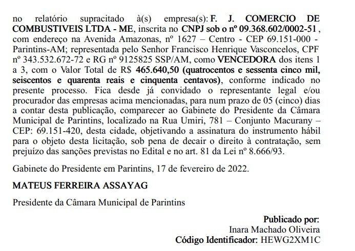 O presidente da Câmara Municipal de Parintins, Mateus Ferreira Assayag, homologou nesta segunda-feira (21) a licitação referente ao pregão 001/2022-CPL/CPMP para a contratação de fornecimento de combustível no valor de R$ 465 mil.