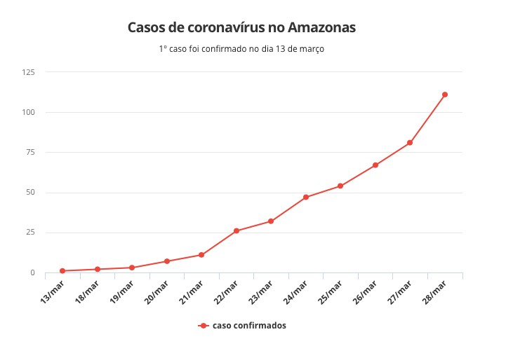O número de casos confirmados do novo coronavírus no Amazonas subiu para 111, segundo o governo estadual. Há registro de casos em Manaus, Parintins, Manacapuru, Santo Antônio do Içá e Boca do Acre. O aumento entre sexta-feira e este sábado foi de 30 novos contaminados.