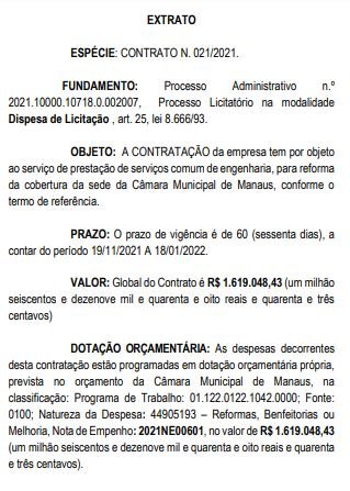 A Câmara Municipal de Manaus (CMM) gastará mais de R$ 1,6 milhão para reformar a cobertura da sede. O contrato nº 021/2021 foi assinado pelo presidente do Parlamento Municipal, David Reis (Avante) e publicado no Diário Eletrônico da Casa Legislativa nesta segunda-feira (29).