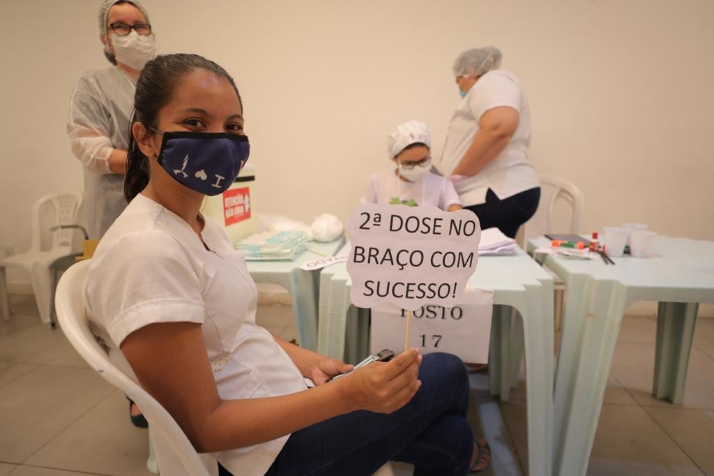 A técnica de enfermagem Vitória Sousa, de 22 anos, compareceu na noite de sábado ao Centro de Convenções Vasco Vasques recebeu a segunda dose da vacina.