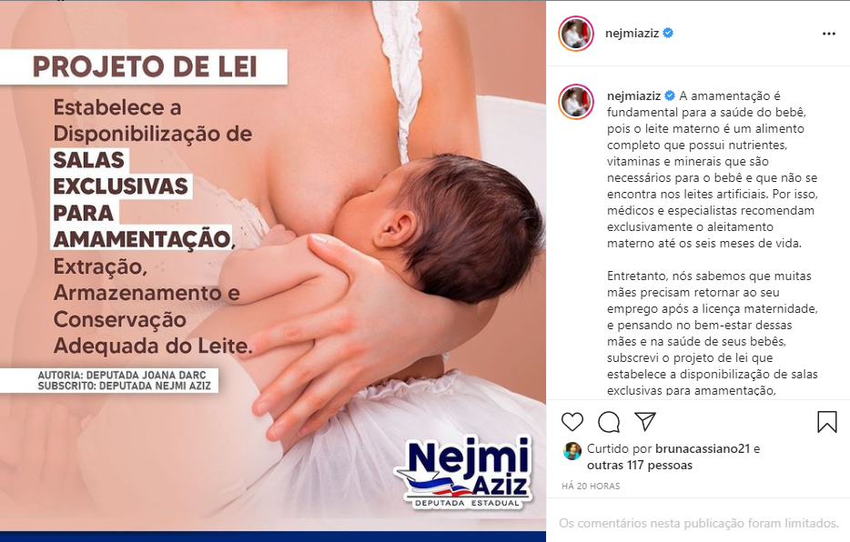 Nas suas redes sociais, é possível ver alguns exemplos, como o Projeto de Lei de nº 485/2019, de autoria da deputada Joana Darc(PL), que disponibiliza Salas Exclusivas para amamentação. Nejmi afirma que subscreveu o PL, quando na verdade não o fez, conforme consta no Sistema de Apoio ao Processo Legislativo (SAPL) responsável pelos trâmites das matérias na Aleam.