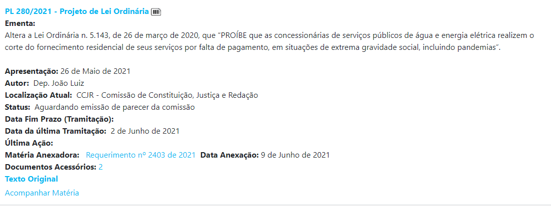 Outro exemplo é o PL nº 280/2021, do deputado João Luiz(Republicanos), que proíbe o corte do fornecimento de água e energia de famílias beneficiadas com a Tarifa Social.