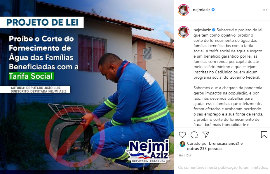 “Subscrevi o projeto de lei que tem como objetivo, proibir o corte do fornecimento de água das famílias beneficiadas com a tarifa social. Sabemos que a chegada da pandemia gerou impactos na população, e por isso, nós devemos trabalhar para ajudar essas famílias que infelizmente, foram afetadas e acabaram perdendo o seu emprego e a sua fonte de renda”, divulgou em suas redes sociais.