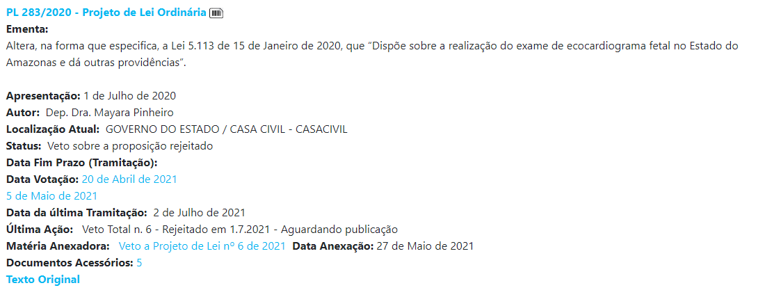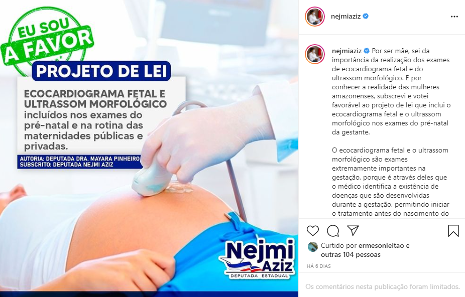 No último dia 1º de julho, a parlamentar foi contra o veto ao PL nº 283, de autoria da Deputada Mayara Pinheiro (Progressistas), que inclui os exames de Ecocardiograma Fetal e Ultrassom Morfológico no pré-natal. O projeto já havia passado da fase de encaminhamento, foi aprovado pela Aleam e seguiu para sanção do governo.