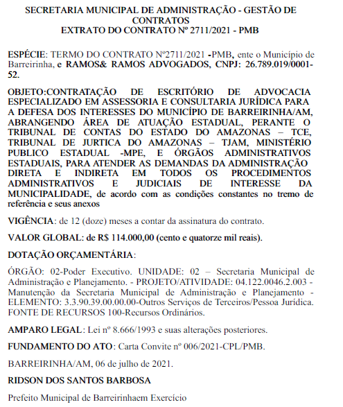 Além disso, a prefeitura também contratou as empresas Antônio Batista Advogados Associados e a Ramos & Ramos Advogados, nos valores globais de R$ 108 mil e R$ 114 mil respectivamente. Conforme os contratos, ambas prestarão assessoria e consultoria jurídica para “a defesa dos interesses de Barreirinha” perante o Tribunal de Contas do Estado do Amazonas (TCE), Tribunal de Justiça do Amazonas (TJAM), Ministério Público Estadual (MP-AM) e demais órgãos públicos.