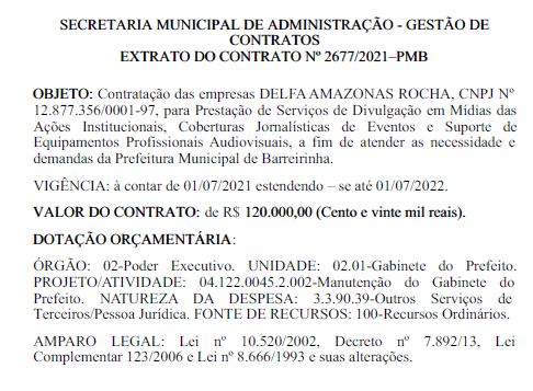 Conforme o Extrato do Contrato nº 2677/2021, o valor de R$ 120 mil será pago à empresa Delfa Amazonas Rocha para prestação de serviços de divulgação em mídias das ações institucionais, coberturas jornalísticas de eventos e suporte de equipamentos profissionais e audiovisuais. Caso o valor seja dividido por 12 meses, a empresa vai receber R$ 10 mil por mês para o serviço.