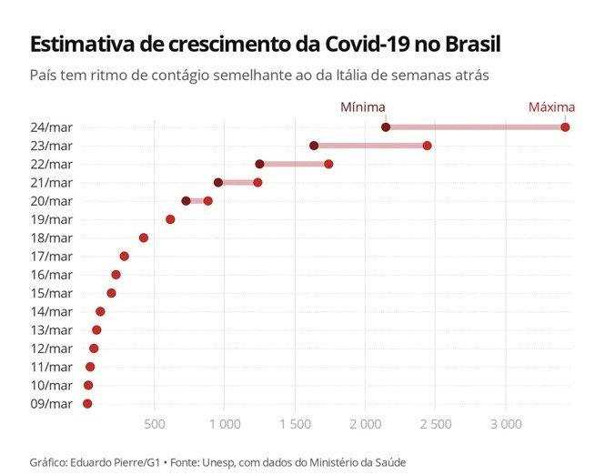 O balanço desta quinta-feira (19) do Ministério da Saúde apontava 621 casos em todo o país, sete pessoas já morreram. “Nossos cálculos corroboram a ideia que o início da curva epidêmica brasileira é igual às da Itália e da Espanha — quando estes países estavam no início”, afirmou ao G1 o professor Roberto Kraenkel, do Instituto de Física Teórica da Universidade Estadual de São Paulo (Unesp).