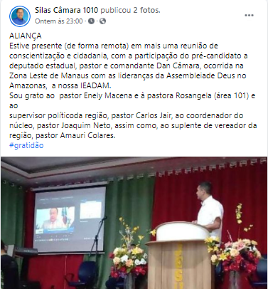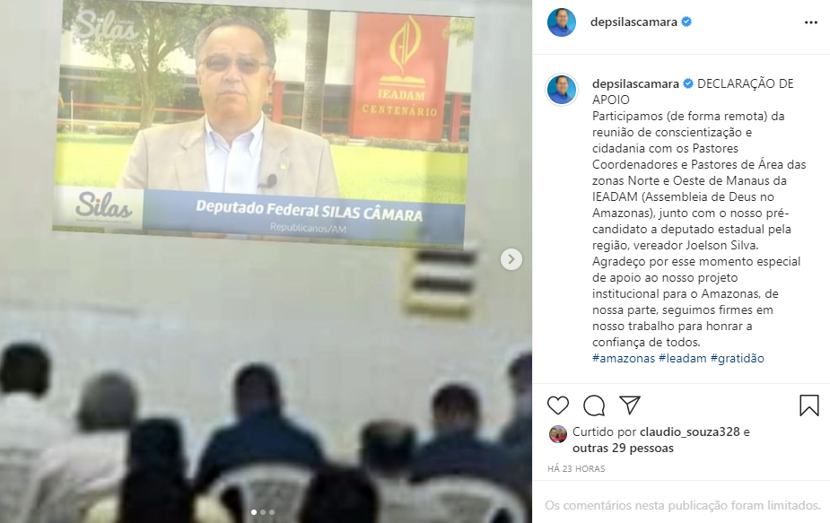 O deputado federal Silas Câmara (Republicanos) já declarou quem vai apoiar na disputa por uma das 24 cadeiras na Assembleia Legislativa. Por meios das redes sociais, o parlamentar anunciou o vereador Joelson Silva (Patriota) e o pastor da igreja Assembleia de Deus no Amazonas (Ieadam), Dan Câmara, seu irmã, como pré-candidatos a deputado estadual.
